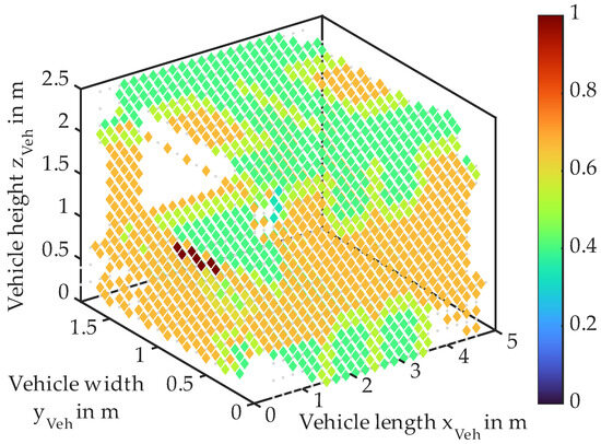 In addition to optimizing the system design and placement of the power supply system, the aim is to achieve overall vehicle optimization. In terms of the vehicle’s performance, this is considered in the evaluation criteria of the genetic algorithm. Requirements regarding the position of the battery cell are considered too. The battery’s volume is constrained by the space below the cabin and between the wheels. The battery’s height is determined by the number of cells necessary to fulfill the range requirements. This ensures that the battery can still be manufactured and mounted as a single component and a logical separation of the battery cells B = {B1, …, Bm}, 1 ≤ i ≤ m, to the zones brings modularity and reliability. To avoid compromising driving dynamics, the battery cells are positioned on the chassis floor symmetrically to the longitudinal axis. The placement in the transverse direction is determined by the position and power distribution of the drive units. The UNICARagil platform uses four drive units with equal power share, each in one corner resulting in a symmetrical placement in reference to the transverse axis. Many passenger cars have one drive unit in the front, causing a shift towards the front of the vehicle. Once the entire battery is placed, the cells are logically separated based on their nearest zone, considering the assigned number of battery cells. Therefore, there are no battery cells Bi* with a shorter Euclidean distance to the cluster center µi than its assigned cells Bi, so the following applies: