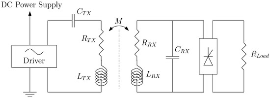 In recent years, the use of Inductive Power Transfer (IPT) has increased in many applications where cables are not desired or cannot be used, such as medical implants [1], wireless sensor nodes [2], smart textile wearable devices [3], electrical vehicles [4], and robots [5]. Typically, IPT systems are based on coupled-mode theory in an oscillating electromagnetic field with a transmitter coil (TX) and a receiver coil (RX), respectively. Figure 1 shows the TX and RX coils that are represented by inductors and , with their equivalent series resistances represented by and , respectively [6]. The resonant capacitor is connected in series with , and the resonant capacitor is connected in parallel with . Both coils are connected to a compensation capacitor to reach the resonance at the same operating frequency , where the transmitted power and the system’s efficiency increase. These capacitors can be connected in various arrangements: serial–serial (SS), serial–parallel (SP), parallel–parallel (PP), and parallel–serial (PS). For textile applications, the SP arrangement is the most advantageous since it ensures a higher power transfer efficiency (PTE) compared to other topologies [7]. The load, represented by the resistance , is powered by the rectified DC voltage from the receiver circuit. The resistances ( and ) introduced by the coupled coils waste power when the alternating currents pass through the coil, thereby reducing the system’s efficiency. These losses due to the resistances decrease the power transfer efficiency. Consequently, these resistances should be as small as possible.