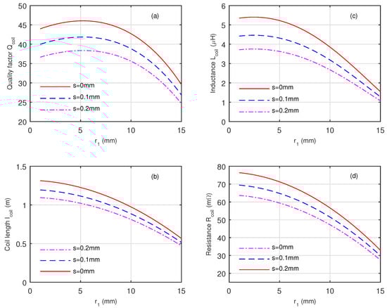 To define the optimal spacing (s) value that provides the highest coil quality factor in this case, Figure 4 presents the evolution of the coil quality factor in terms of the internal radius for different values of s ( mm) and for the wire width 1 mm. According to this figure, the highest coil quality factor () corresponds to the lowest spacing () and an internal radius of mm. However, the case where mm cannot be applied during the fabrication process; therefore, mm can be defined as the optimal spacing between wires.