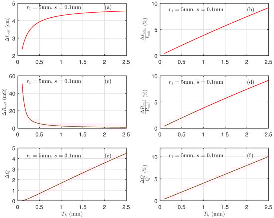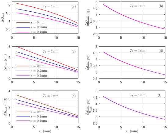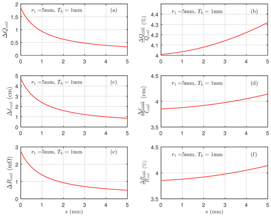 Deviation between the spiral shape and the circular shape in the computation of (a) the coil quality factor, (b) the coil quality factor in terms of the spacing ( mm) between the coil lines for the internal radius mm, (c) the coil length, (d) the coil length in terms of the spacing ( mm) between the coil lines for the internal radius mm, (e) the coil resistance, (f) the coil resistance in terms of the spacing ( mm) between the coil lines for the internal radius mm.