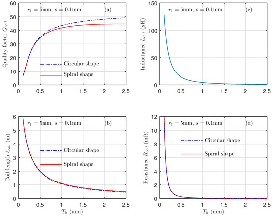 Comparison of the spiral shape coil and the approximated coil for N circular turns for the spacing mm and internal radius mm: (a) coil quality factor (), (b) coil length (), (c) coil inductance (), and (d) coil resistance ().