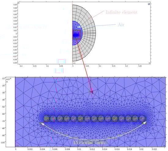 Mesh created in the infinite elements, the air, and the 15 circular turns.