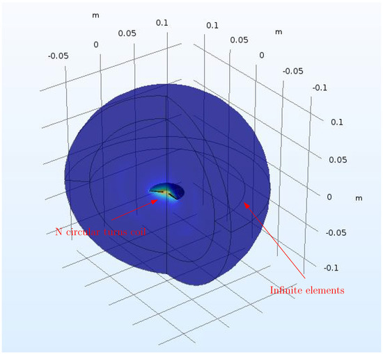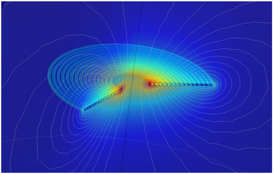 The 15 small circles represent the 15 turns of the coil in the 2D plane. Then, we created the mesh elements, as shown in Figure 10. Later, we transformed the 2D model into a 3D model, as illustrated in Figure 11. Figure 12 illustrates the representation of the optimized coil with the magnetic flux lines. The simulation results from COMSOL yielded a coil self-inductance of H and a coil internal resistance equal to m. These results were similar to those obtained for the approximated coil without considering the skin effect. In fact, in this case, the COMSOL software neglected the skin effect, which was equal to 0.2 mm.