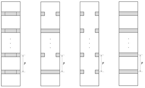 Figure 3 shows the arrangements of the rectangular turbulator investigated in this study. In Array A, the turbulators are installed on both the fin’s side and base surfaces at the same position with a pitch of 43.2 mm. Therefore, the side and base turbulators are overlapped in this arrangement. In Array B, rectangular turbulators are placed sequentially on the side and base surfaces in the direction of the airflow. The pitch of the installed turbulators remains the same at 43.2 mm. Thus, the total number of installed turbulators in Array B is lower than in Array A. In Array C, the turbulator is located only on the side surface of the fin with a pitch of 43.2 mm. Thus, the number of turbulators in Array C is higher than in Array B. Array D has a turbulator only on the base surface of the fin with a pitch of 43.2 mm. Therefore, Array D has the lowest number of turbulators in a finned air channel. For all arrangements, heat transfer augmentation and friction penalty were evaluated with five different Reynolds numbers ranging from 3000 to 15,000.