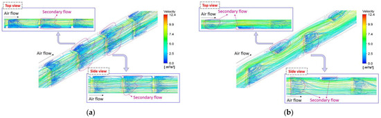 Figure 13 shows a three-dimensional flow pattern inside the finned air channel for different arrangements with the same velocity scale. The lines represent streamlines, while the color of the lines indicate velocity magnitude. In the figure, it can be seen that the secondary flow occurs after the flowing air passes the turbulator. Among the investigated arrangements, Array A exhibits the largest secondary flow region, and a substantial secondary flow was induced at the rear region of the overlap between the side and base turbulators. In Array B, a secondary flow occurs either on the side surface or the base surface, and in Array C, it occurs only on the side surface. It is also seen that the secondary flow region in Array B and Array C is lower than in Array A due to the absence of overlapped turbulators. In Array D, a secondary flow occurs only at the base surface, resulting in the lowest secondary flow region, which results in the lowest enhancement in friction factor.
