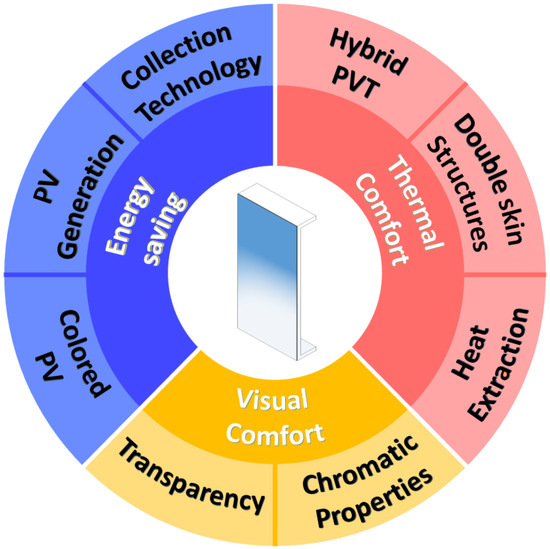 All aspects related to thermal comfort are not of secondary importance, namely, the thermal energy transmission coefficient, U-value (W/(m2K)), SHGC, and solar factor (SF). The U-value quantifies the window heat-insulating properties, whereas the SHGC and SF are dimensionless coefficients, respectively, measuring the solar radiation and the energy transmitted to the window. Both the SHGC and SF range from 0 to 1, with 0 indicating a glaze with no transmittance of radiation or energy while 1 represents the full transmittance of the related quantities [129]. Despite having minor differences, the SHGC and SF are used as alternative parameters to evaluate solar penetration through transparent or semi-transparent surfaces.
