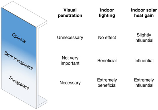 In terms of architectural and functional design, a façade’s optical properties depend on building energy and lighting needs. In Figure 2, an illustration that clarifies the effects of external skin transparency on indoor spaces is presented.