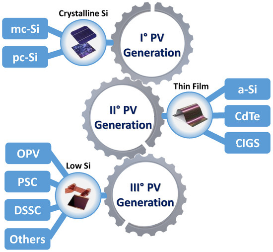 The efficiency of PV modules, currently in the range of 12–23% for commercial devices [2], depends strongly on the panel technology and its working conditions [41]. Depending on the technologies on which they are based, cutting-edge solar modules can have either single or multiple active layers. These layers may perform the proper conversion of solar energy into electrical energy, or improve the absorption of solar radiation in different ranges, thus enhancing the entire device efficiency [60]. A widespread methodology to classify solar cells and PV panels is based on the technology used for solar cell fabrication: each PV module can be subdivided into three main generations strictly related to the amount of contained crystal silicon [61]. The different generations are depicted in Figure 4. The first generation is characterized by the presence of crystalline silicon (c-Si) solar cells [62], which can be subdivided into monocrystalline (mc-Si) [63,64] or polycrystalline (pc-Si) silicon solar cells [65,66]. Standard second-generation PV panels are thin-film (TF) solar cells that present several advantages over first-generation c-Si devices, especially for building integration, having a lower thickness with respect to the first-generation ones. Indeed, the possibility of achieving TF solar cells with a thickness that ranges from a few nanometers to a few microns opens the possibility to tailor the flexibility, weight, and transparency of these devices according to their function in the building envelope. In addition, as the cell cost accounts for roughly 50% of the total module price [67], if the manufacturing cost of TF technologies competes with first-generation PV solutions, their implementation may lead to a potential cost reduction [68]. For this reason, research activities aiming to improve the efficiency of TF devices based on different technologies, such as copper–indium–gallium–selenide (CIGS) [69,70], cadmium telluride (CdTe) [71,72], or amorphous silicon (a-Si) [73,74], have significantly increased.