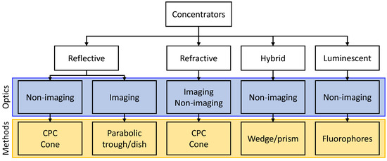Solar concentrators can be clustered according to the optics, as imaging or non-imaging, or according to their concentration method, since they can be categorized as reflective, refractive, hybrid, or luminescent concentrators [88]. Additionally, CPCs can be subdivided into either two-dimensional or three-dimensional concentrators, depending on whether the concentration is performed on one or two planes [88]. Figure 5 shows the classification of BICVP technologies used in this review.