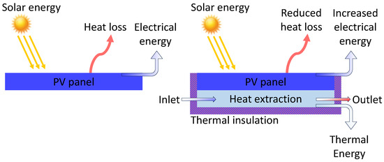 The electrical power supplied by PV panels depends also on their temperature. In fact, the rating plate of these devices is measured under specific Standard Test Conditions (STCs): irradiance of 1000 W/m2, ambient temperature of 25 °C, and wind speed of 1.5 m/s [103]. Typically, during standard test procedures, the modules are irradiated via flash lamps; thus, the ambient temperature corresponds to the cell temperature, even under STC irradiance. However, in on-field working conditions, if cells are exposed to 1000 W/m2, they reach a considerably higher temperature, thus diminishing the power produced by the modules [104,105]. The prolonged increase in the panel surface temperature contributes to an increment in the panel shunt resistance as well as to the creation of hot spots, which not only decrease their performance, but also have an impact on their lifetime. For this reason, the coupling of PV modules with thermal collectors is a widely adopted solution to control the panel overheating, generating the so-called PVT systems. Figure 6 shows the difference between PV and PVT systems and the efficiency increase due to the presence of a thermal collector.