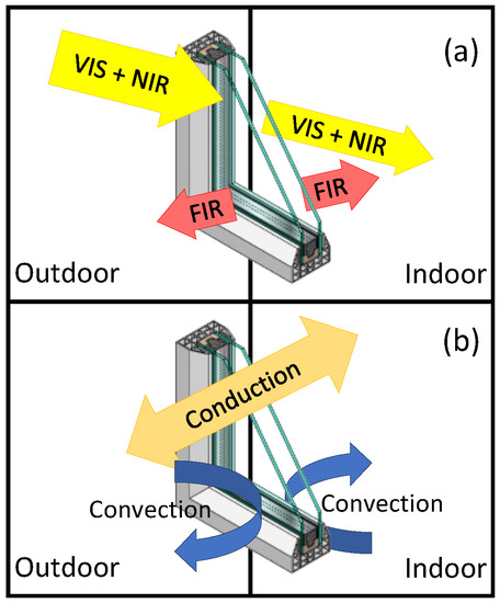 Schematic of a standard window showing (a) the radiative and (b) the conductive and the convective heat transfer mechanisms.