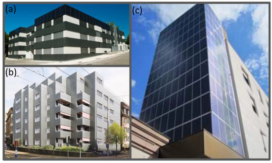 (a) Southwest view of the building after the retrofit, reproduced with copyright permission from [140]. (b) Renovation of a residential building in Zurich, reproduced with copyright permission from [145]. (c) Picture of the BIPV system installed in Bolzano, reproduced with copyright permission from [138].