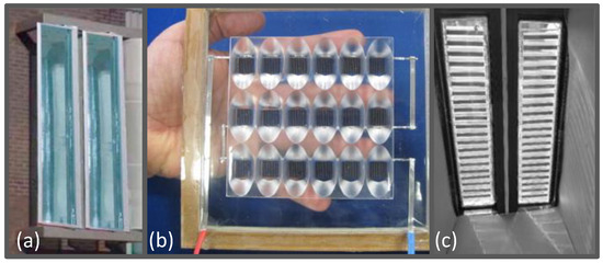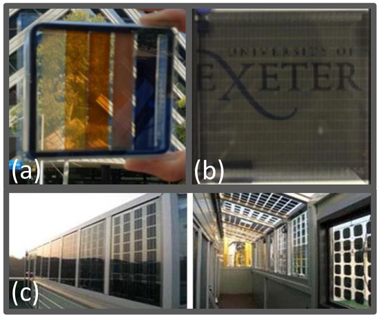 (a) Vertical installation of PVT-integrated devices described in [152] (reproduced with copyright permission). (b) Picture of the window-integrated concentrating photovoltaic system designed in [157] (reproduced with copyright permission). (c) Interior view of the mock-up building realized in [164] (reproduced with copyright permission).