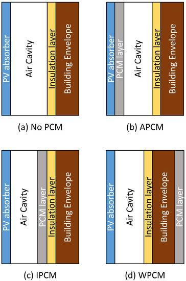 - Ke, W.; Ji, J.; Zhang, C.; Xie, H.; Tang, Y.; Wang, C. Effects of the PCM Layer Position on the Comprehensive Performance of a Built-Middle PV-Trombe Wall System for Building Application in the Heating Season. Energy 2023, 267, 126562. [Google Scholar] [CrossRef]