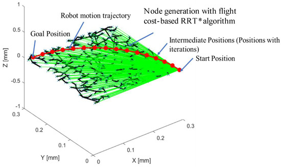 Lavalle and Kuffner [18] introduced a rapidly exploring-based random tree (RRT) approach to overcome the limitations of the PRM in various motion planning configurations, including structures with up to twelve degrees of freedom. The fundamental principle of RRT is that the root of the tree represents an initial position, and newly generated positions are connected to neighboring positions within the random tree. However, RRT does not always guarantee an optimal solution for the robot’s trajectory [21]. To address the optimality issue in motion planning, researchers proposed RRT-star (RRT*), an improved variant of RRT that is asymptotically optimal [16]. By incorporating features such as tree rewiring and searching for the best neighboring node, RRT* enhances the quality of the resulting path. However, achieving asymptotic optimality with RRT* requires a longer implementation time and a slower convergence rate for the path. Furthermore, Qi and his research group introduced a multi-objective dynamic RRT* (MOD-RRT*) algorithm, which is suitable for robot navigation in unknown dynamic environments. MOD-RRT* aims to find the optimal node among multiple candidates within a short period by employing path initiation and path replanning techniques [22]. Kwon et al. [23] proposed the dual-tree RRT* to generate rapidly growing trajectories while considering the kinodynamic limitation of robots in constrained and cluttered environments. This approach employs two tree topologies with minimal computational cost. Fang and Ding [24] proposed a comprehensive framework for active visual measurement using an industrial robot based on a high-productivity and high-performing sampling-based motion planning approach. The proposed route planner utilizes the RRT-based planning approach to generate a point-to-point path in the joint space that satisfies the camera’s field of vision requirements while ensuring obstruction-free and conflict-free constraints. Recently, Zhang et al. [25] proposed a multi-objective optimization approach using deep reinforcement learning for the trajectory-planning problem of a six-axis robotic arm, aiming to minimize factors such as accuracy, energy consumption, and smoothness, and demonstrates its effectiveness compared to the RRT algorithm through simulations and physical experiments.