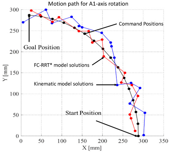 To tackle the challenges of industrial robot motion planning, this study utilizes a unique flight cost-based rapidly exploring random tree star (FC-RRT*) algorithm for each rotating axis of a 6-DOF serial type of industrial robot. Guo et al. [39] introduced the FC-RRT* algorithm for mobile robots to deal with safety regulations and flight constraints in complex 3D environments, without considering energy consumption. In the FC-RRT* algorithm employed in this study, the flight cost function and flight limitations are fully incorporated during the node extension and utilized as heuristic information to guide the expansion of tree nodes. This motion planning technique promotes node creation in a defined direction rather than a random approach based on a heuristic algorithm as a function of cost and time. Furthermore, the flight cost function and flight constraints are also utilized to influence the update of parent nodes. Thus, a method is devised that combines the guidance of the flight cost function and flight constraints to discover an optimal path with the shortest length that satisfies both optimality and requirements. In the experiment, the power consumption for the rotary axis is examined by conducting the axis indexing test, as defined in the literature [9,40]. As demonstrated by the researchers, the axis indexing test, based on the “circle point method” has inherent effects on the end effector positions of the robot due to changes in joint axis angles [8].