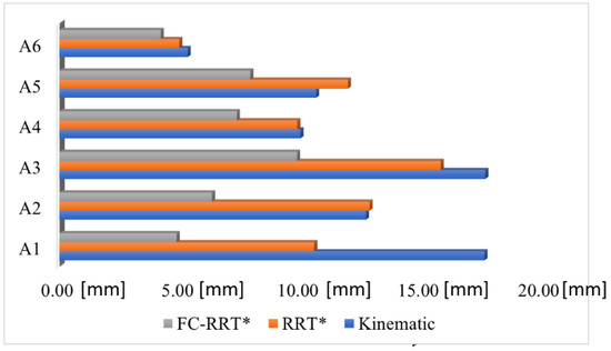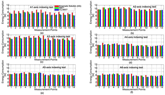 - The experiment results of the axis indexing tests indicate that by employing the sampling-based FC-RRT* algorithm, the robot joints consume less energy (1.6% to 16.5% less) compared to both the kinematic solution and the conventional RRT* algorithm.