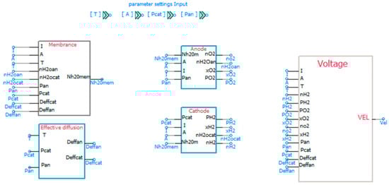 In this section, we describe simulation modeling in PSCAD/EMTDC software according to the proton exchange membrane mathematical model in Section 1. The schematic diagram of the proton exchange membrane electrolyzer simulation model is shown in Figure 2. Through the temperature, membrane area, cathode, anode pressure and membrane diffusion coefficient, the gas partial pressure and the amount of substance were calculated. Finally, the working voltage of the electrolytic cell was calculated using the electrochemical equation.