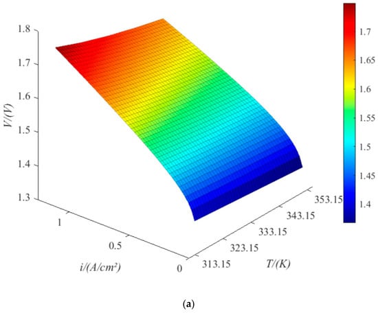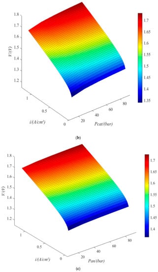 - When the current density is 1.18 A/cm2, the terminal voltage is 1.75 V at a temperature of 314 K, 1.65 V at a temperature of 352 K, 1.4 V at an exchange current density of 10–1.34 A/cm2, 1.57 V at an exchange current density of 10−9.04 A/cm2, 1.67 V at a cathode pressure of 11.5 bar, 1.73 V at a cathode pressure of 88.5 bar, 1.69 V at an anode pressure of 11.5 bar, and 1.72 V at an anode pressure of 88.5 bar. The trend is the same under low current density. Therefore, increasing the pressure of anode and cathode is beneficial to improving the working current density; increasing the exchange current density and increasing the temperature of the electrolytic cell are conducive to reducing the power consumption of the electrolytic cell.