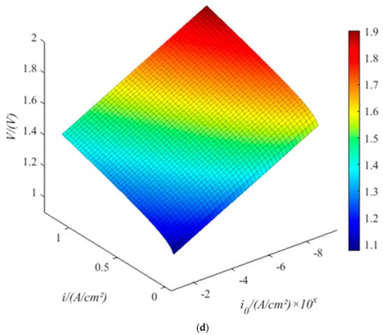 When the current density is 1.18 A/cm2 and the exchange current density is 10−1.34 A/cm2, the terminal voltage is 1.4 V. When the exchange current density is 10−9.04 A/cm2, the terminal voltage is 1.57 V. This trend is the same under small current density. The exchange current density is negatively correlated with the voltage of the electrolytic cell. The exchange current density reflects the difficulty of electrode reaction. According to the principle of electrochemistry, a higher exchange current density means that, under a certain total current density, the required overpotential is small. The higher the exchange current density, the smaller the influence on the over potential, the weaker the polarization effect, the less the electric energy consumption, and the voltage of the electrolytic cell decreases.