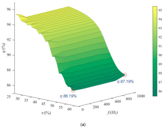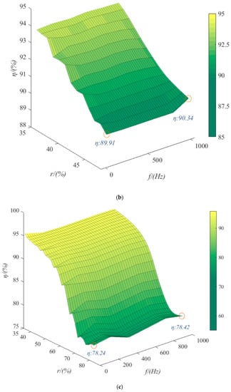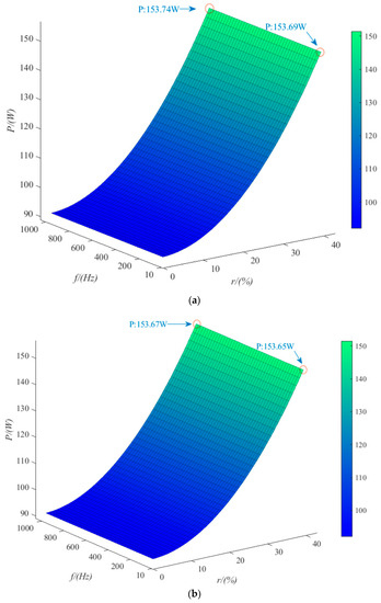 Figure 6 shows that, under a sine wave, when the ripple coefficient was 40%, the average power consumption was 153.69 W at 25 Hz, and 153.74 W at 1000 Hz. Under a triangular wave, when the ripple coefficient was 40%, the average power consumption was 153.65 W at 25 Hz, and 153.67 W at 1000 Hz. Under a square wave, when the ripple coefficient was 40%, the average power consumption was 153.94 W at a frequency of 25 Hz, and 154.03 W at a frequency of 1000 Hz. As the ripple becomes smaller, the trend stays the same.