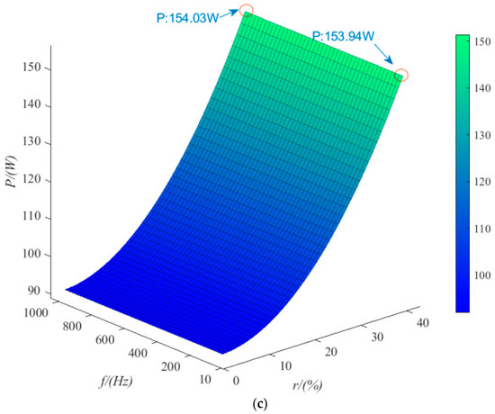 Influence of ripple coefficient and frequency on average power consumption. (a) The influence of the ripple coefficient and frequency on average power consumption under sinusoidal ripple voltage. (b) The influence of the ripple coefficient and frequency on average power consumption under triangular ripple voltage. (c) The influence of the ripple coefficient and frequency on average power consumption under square ripple voltage.
