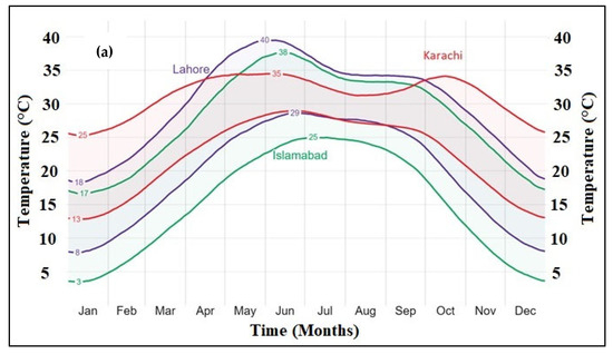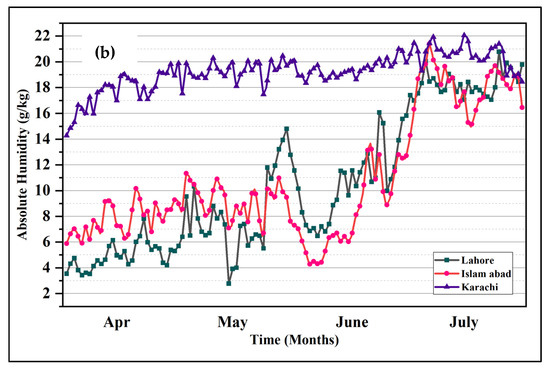 Climate conditions of selected cities of Pakistan: (a) dry-bulb temperature, (b) absolute humidity.