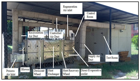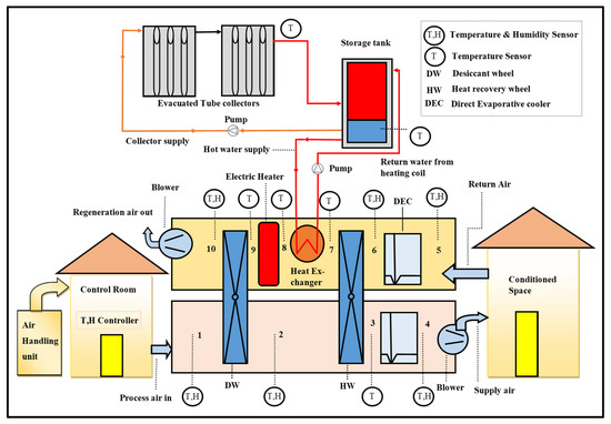 The solar-assisted desiccant-based evaporative cooler (Sol-DEC) mainly consists of three parts for testing purposes: (i) solar evacuated tube collectors (SETCs) for the heating of water, (ii) a rotary desiccant wheel integrated with a direct evaporative cooler, (iii) a control room to maintain the temperature and humidity artificially at an inlet of the desiccant wheel (DW), and a test room to check the performance of the system. A schematic diagram of the whole system with exact sensor locations is shown in Figure 3.