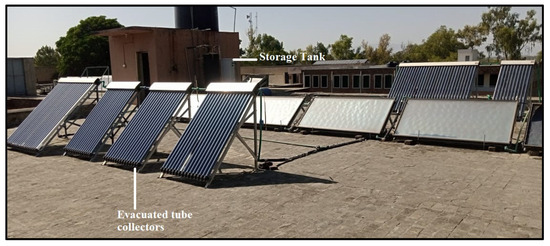 Solar evacuated tube collectors (SETCs) are installed on the roof of the Department of Energy Engineering, University of Engineering and Technology, Taxila, Pakistan, to harvest the energy of the sun to heat the water at a desired level. SETCs, along with the storage tank, are shown in Figure 4. Since DW is a thermally driven cycle, heat energy input is necessary to regenerate the desiccant material of the DW. Different conventional methods, such as waste heat, gas burners or electric heaters, can provide this thermal energy. However, in this research, hot water is used as the working fluid and SETCs are used to capture solar energy from the sun. SETCs are used as these collectors have less thermal loss as compared to flat plate solar collectors. A storage tank with a capacity of 0.3 m3 was installed to store the hot water. Rock wool is used to insulate the storage tank of water. Hot water circulates between the SETCs and storage tank with the help of a small magnetic-type water pump; a magnetic water pump delivers the water at the flow rate of 560 kg/h. Ball valves are installed at different locations to control water flow in the closed cycle of the SETCs. Glycol is used in a closed process between the SETCs and the storage tank to avoid steam production in the pipes due to high radiation. Steam in pipes can slow down or stop the circulation of the water. For safety purposes, a steam relief valve is installed within the storage tank to release steam if it is generated. Two K-type thermocouple water temperature sensors are installed at the bottom and top of the storage tank. One thermocouple water temperature sensor was installed on the outlet pipe from the SETCs. The temperature gradient required to maintain water circulation between the SETCs and the storage tank was 8 °C. An electric water heater is installed in the storage tank as a backup to achieve the desired temperature if solar heat is not available. A separate solar controller is installed to control the on/off switch of the magnetic pump and the electric water heater of the storage tank. The solar controller can set the temperature of the electric water heater up to 80 °C; the maximum temperature drop recorded in the air-to-water heat exchanger was 4 °C. To regenerate the desiccant wheel, hot water was supplied from the storage tank to the air-to-water heat exchanger through gravity. However, a separate water pump was used to pump the water from the air-to-water heat exchanger to the storage tank to continue the water cycle.