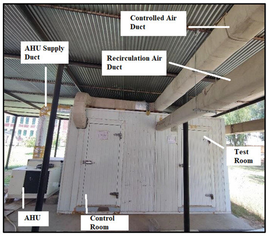 The SDI-DEC is tested under control conditions; for this purpose, an insulated room setup is installed on the ground near the Department of Energy Engineering, University of Engineering and Technology Taxila. This insulated room was first designed carefully in 3D view and then installed. The total dimensions of the installed room setup are 4.57 × 3.05 × 3.05 m3, and it is separated into two rooms: the test room and the control room/climatic chamber. The control room creates an artificial environment condition to supply the desired inputs in terms of temperature and humidity to the SDI-DEC. The test room is used to check the SDI-DEC system’s performance under load conditions. An air handling unit (AHU) is installed in the control room to create artificial conditions in the control room. Artificial conditions are made in terms of cooling, heating and humidification. The AHU consists of three parts: (i) a vapor-compression system for cooling, (ii) a humidifier for humidification of the air and (iii) an electric heater to maintain the heating needed in the control room. Maintaining a wide range of testing conditions can create all forms of weather, like dry or humid, hot or cold, in the control room. Figure 6 shows the real-time installation of both rooms. The dimensions of the control room and test room are given in Table 4. To control supply conditions, air from the control room moves to the test rig as the input of the DW through duct 1 (controlled air duct). Proper insulation of duct 1, which is made of sheet metal, is maintained to reduce energy losses. Duct 2 (supply air duct) is used to supply the process air from the SDI-DEC to the test room. Duct 3 (load duct) connects the control room and tests from the top of both rooms. Duct 3 is used to create load conditions in the test room to check the SDI-DEC’s performance against different loads. This ducting system is made of sheet metal and properly insulated to reduce the heat loss from the ducts. A schematic diagram of ducting within the SDI-DEC is shown in Figure 7. Different volume control dampers (VCDs) of rectangular shapes are installed at various suitable locations to control the air flow rate in all of the ducts.