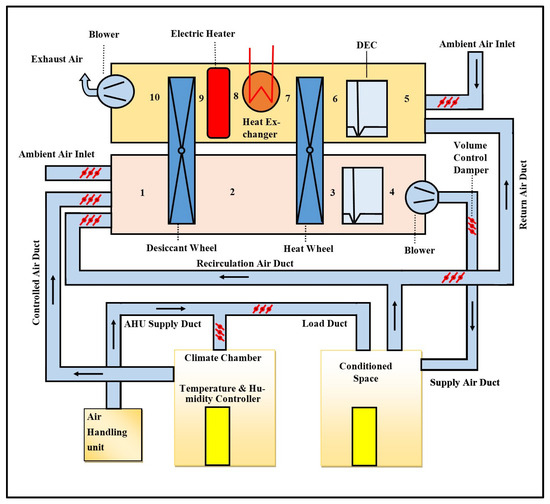 Energy consumption demand is increasing with rising living conditions. Environmental pollution and global heat are being raised along with greenhouse gas emissions [1]. Systems for heating, ventilation and air conditioning consume a huge portion of the overall energy used in building services. For instance, a survey by the International Energy Agency found that, in 2016, refrigeration systems accounted for 6% of all energy supplied to buildings [2]. In the last few decades, the energy demand for cooling systems has considerably increased due to population growth, technological advancements and materialistic living standards. Air cooling units account for almost 15% of the energy used worldwide. The conditions for a person’s thermal comfort are considered in terms of the effective management of sensible and latent load. An air conditioning system should typically maintain indoor air temperatures of 18 to 26 °C and relative humidity levels of 40 to 70% in order to provide thermal comfort conditions to the occupants [3].