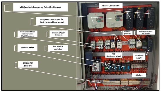 Experiments are carried out under a proper controlling and monitoring setup. The temperature, relative humidity, electric current and rotation of both air suction fans are measured in the test rig. Different humidity and temperature sensors are used separately at various locations of the test rig. The electric signals of temperature sensors are recorded using transmitters and monitored through a computer-controlled data acquisition system. Three variable frequency drives (VFDs) are installed in the control panel; two of them are used to control the speed of two fans, and one is used to control the speed of the desiccant wheel. The SDI-DEC system has four types of controls: (i) a programmable logic controller (PLC), (ii) an electric heater controller, (iii) a solar system controller, and (iv) a controller for the AHU. The function of the PLC is to (i) control the operation of the test rig; (ii) control the on/off operation of the DW, HRW, fans, electric heater and water pumps; (iii) regulate the speed of both fans and the DW; and (iv) control the magnetic contractors through relays. All the installed sensors give input to the PLC. After PLC decoding, this input is displayed as reading on the human–machine interface (HMI) screen. The HMI is used to monitor the values of all the sensors that were installed in the test rig and is also used to set the desired value for the type of electric heater and rpm of fans. Electric controllers control the electric fin-type heater to maintain the regeneration operation and protect the electric fin-type heater from any fluctuation in electric current. The solar system controller is installed separately to switch on/off both the magnetic pump installed between SETCs and the hot water storage tank as well as the auxiliary heater installed in the hot storage tank. The controller records the readings of the K-type thermocouples installed in the hot water storage tank and SETCs. The AHU controller is installed in the control room to operate the AHU. The vapor-compression system, fan, electric heater and humidifier installed in the AHU are run through this controller. The AHU controller is also used to set the desired heating, cooling and humidification value in the control room. Figure 8 shows the controller setup used to control the whole test rig in the control environment. Solar radiation is measured through the pyranometer with an accuracy of 1 W/m2. Specifications of all the temperature and humidity sensors and other instruments used in the testing are given in Table 5.