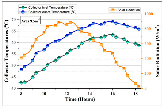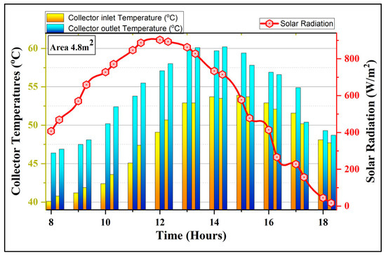 The solid desiccant cooling system utilizes solar energy to cope with latent load via heating water through solar thermal collectors. Solar energy is required to regenerate the desiccant wheel during the regeneration process; SETCs are used to serve this purpose. Solar thermal energy varies with respect to time due to the fluctuation of solar intensity throughout the day. Figure 9 and Figure 10 depict the variation in the collectors’ temperature along with solar irradiance for two different collector areas of 9.7 m2 and 4.8 m2, respectively. It can be observed that solar radiation significantly influences the outlet temperature of the water from the collectors. In the morning, solar irradiance is low, which results in low water outlet temperature. Similarly, in the evening, the outlet temperature drops due to the low intensity of solar radiation. The collector’s size strongly influences the efficiency of a solar thermal collector; a larger area results in higher outlet temperatures, ultimately improving the overall performance of the solid desiccant cooling system. The maximum outlet temperature achieved from collectors with an area of 9.7 m2 was 69.1 °C, and 60 °C from collectors with an area of 4.8 m2.
