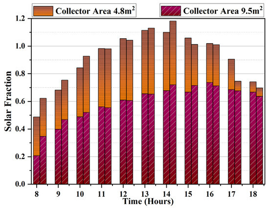 Figure 11 represents the variation in solar fraction for different collector areas with respect to time throughout the day. The observations show that the solar fraction is high when the collector area is 9.5 m2 (configuration 1). The fact is that the larger collector area provides a large surface area for the absorption of solar radiation, which results in a high potential for energy harvesting, leading to an increase in solar fraction. In addition to this, solar intensity also influences the solar fraction. During peak sunshine, the intensity of solar radiation is high. Hence, more energy is present at collectors to convert, increasing the solar fraction. It can be observed that for configuration 1, the maximum solar fraction achieved was about 71%, whereas for configuration 2, the maximum solar fraction achieved was 49%.