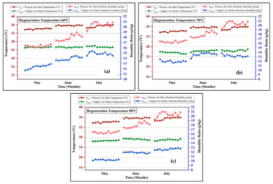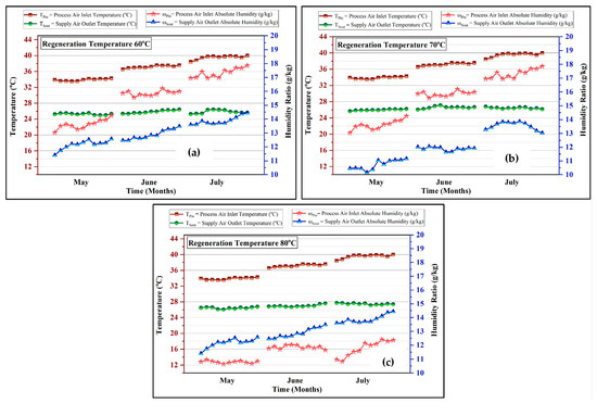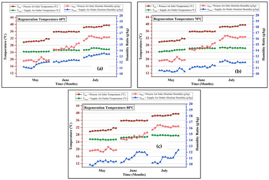 In the climate conditions of Islamabad, where temperatures and specific humidity levels vary across the months, the system’s performance will be influenced accordingly, as illustrated in Figure 13. The average temperature in Islamabad in May, June and July is 30.5 °C, 37.7 °C and 38.7 °C, respectively. The increase in average specific humidity from May to July implies higher moisture content in the process air. It was found that the outlet air humidity decreases when the regeneration temperature is increased from 60 °C to 70 °C. The reason is the increased moisture removal capability of the desiccant wheel at higher regeneration temperatures. The maximum outlet humidity for this hot and semi-humid climate at Treg of 60 °C, 70 °C and 80 °C is 13.5, 12.3 and 11.9 g/kg, respectively.
