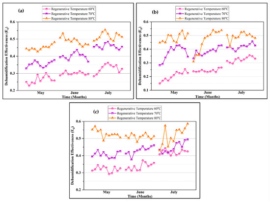 Variation in dehumidification effectiveness: (a) Lahore, (b) Islamabad, (c) Karachi.