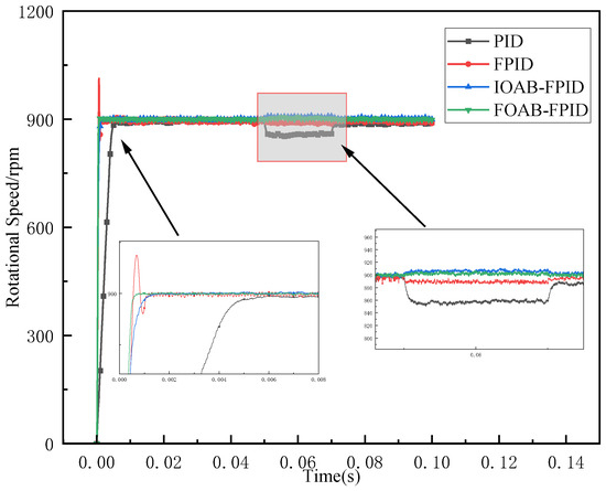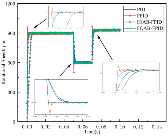 To verify the effectiveness of the design scheme in this paper, the control system of PMSM is built in MATLAB/Simulink, and the parameters of the PMSM system are set in the simulation: stator inductance , motor rotational inertia , magnetic chain , and the number of pole pairs is 4. Considering the influence of the gain on the control accuracy and convergence of the system, the feedback gains , were finally taken as 550 and 950 through repeated tests. The simulation sampling rate is 10 kHz, the simulation period is 0.1 s, and the initial reference speed of the motor is set to 900 rpm. The simulation results are compared for the PMSM system with four controllers: PID, FPID, IOAB-FPID, and FOAB-FPID. The speed is adjusted to 600 rpm at 0.05 s and 930 rpm at 0.07 s. The speed tracking of the system under the four control strategies is shown in Figure 1. When the speed rises in the start-up phase, the PID control responds the slowest, the FPID control responds fast but with a significant overshoot, and the FOAB-FPID control curve is smooth with fast response and no overshoot. The reaction of PID and IOAB-FPID control is slow when the command speed decreases, and the reaction by FPID control and FOAB-FPID control is fast. The adjustment time is short, but the FPID overshoot is still significant, and the result is the same as above when the command speed increases. It can be concluded that the FOAB-FPID control performs best and has the best control performance in the three-time states of the start-up phase, commanded speed decrease, and oversaw speed increase.