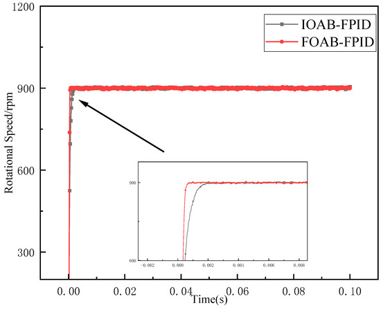 When the PMSM runs at no load, the stator resistance is changed for simulation analysis, and the initial stator resistance value is set to 2.875 . When the PMSM runs at no load, the stator resistance Rs changes as follows: at 0.05 s, add 5 , and at 0.07 s, subtract 3 . A comparison of speed change when stator resistance changes is shown in Figure 3. The figure shows that the FOAB-FPID control has a shorter speed rise time and faster response.
