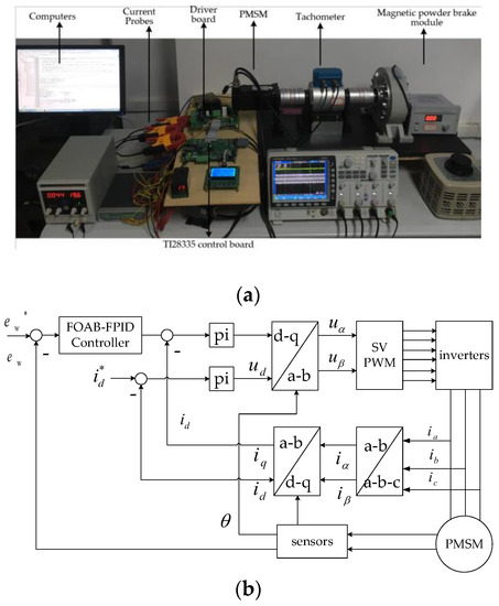 PMSM experimental platform. (a) Experimental platforms. (b) PMSM vector control schematic; ew* is the trajectory of a given position, ew is the actual location, id* is the given current components on d-axis respectively.