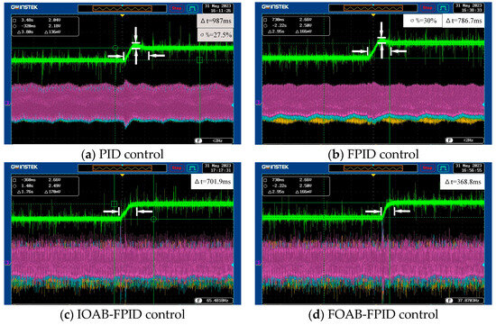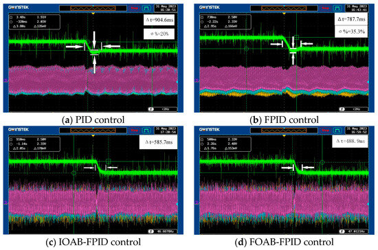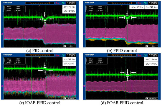 As shown in Figure 7, the motor speed fluctuated under all four controls when the load torque was added, and the percentage speed drop and the specific value could be calculated based on the marker in the upper left corner of the oscilloscope. The speed fluctuated more under PID and FPID control, and overshoot occurred when the rate picked up. The speed fluctuation of IOAB-FPID control is slight, and the response time is fast but fails to return to the command speed. The speed fluctuation of FOAB-FPID control is slight, and the adjustment is fast and returns to the command speed after a particular adjustment time. The performance of the system parameters under the four control schemes is shown in Table 3.