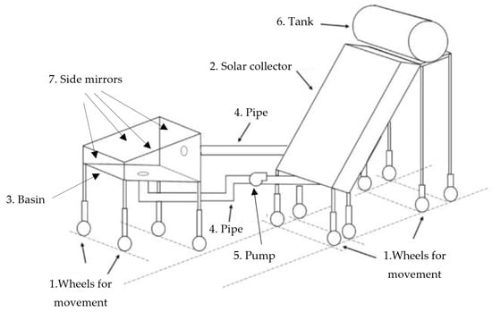 The investigated solar still is shown in Figure 1. The design is furnished with wheels (indicated by number 1 in Figure 1) and a solar collector (introduced by number 2 in Figure 1). Water from the basin (introduced by number 3 in Figure 1) is directed to the solar collector through a pumping mechanism (consisting of pipes and a pump, which are shown by numbers 4 and 5 in Figure 1, respectively), which elevates its temperature. Subsequently, the heated water is circulated into the solar collector parts, including the tank (shown by number 6 in Figure 1), and returned to the basin, which is exposed to direct solar radiation and reflection from the side mirrors (shown by number 7 in Figure 1). This exposure facilitates the evaporation of a portion of the basin’s water. The inclusion of wheels allows the dynamic positioning of the still to optimize solar radiation absorption at each time step.