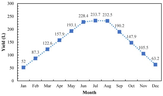 The amount of produced power by a solar still is experimentally available from the previous study of the research team, i.e., Ref. [], for city of Tehran, which is also used for this investigation. The monthly profile is reported in Figure 2. More information about the details of the experiments, including the specifications of the measuring devices, are also found in Ref. [].