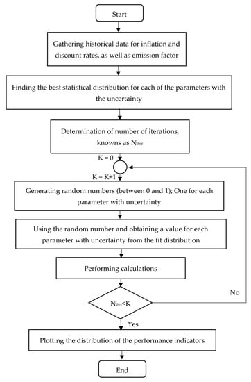 In this study, the uncertainty of the inflation and discount rates, as well as , is considered using the Monte Carlo approach. The process flow chart of the employed Monte Carlo approach, which was mentioned in this part, is provided in Figure 3. Performing calculations with the Monte Carlo approach includes six steps: