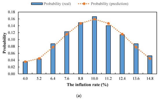 The extracted historical data, in addition to the best found fit for each of the three investigated variables, i.e., inflation and discount rates, as well as , are presented in Figure 4. Figure 4a indicates that the normal distribution is the best fit for the inflation rate, where a mean value of around 10% and a standard deviation of around 2.5% are observed. The highest and lowest probabilities also belong to the ranges with the centers of 10.0 and 4.0%, with the values of 0.167 and 0.035, respectively.