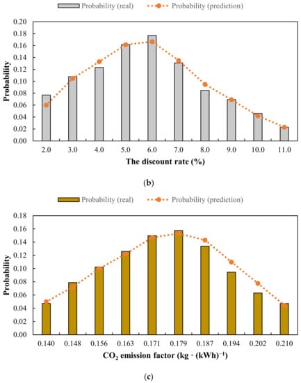 Based on Figure 4c, is something in between, for which the summation of a normal and log-normal distribution brings the best condition. The value around 0.179 kg · (kWh)−1 could be introduced as the mean value. The range is also from 0.140 to 0.210 kg · (kWh)−1, while the maximum and minimum probabilities are found for the mean value, i.e., 0.179 kg · (kWh)−1, and both extreme sides, i.e., 0.140 and 0.210 kg · (kWh)−1. The values for them are 0.157 and 0.047, respectively.