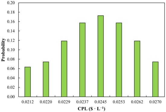 Based on Figure 5, CPL has an almost normal distribution, with the average of 0.0241 $ · L−1, and a standard deviation of 0.0019 $ · L−1. Bearing in mind that among the indicators, inflation has a normal distribution, while discount is closer to the log-normal shape, it was found that inflation makes a greater contribution to the uncertainty of CPL. The uncertainty of CPL is also 0.0058 $ · L−1, which comes from the point at which it varies from 0.0212 to 0.0270 $ · L−1. The obtained value for the uncertainty of CPL indicates a considerable variation range.