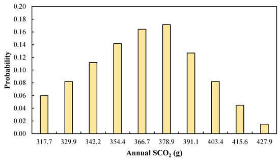 For SCO2, like CPL, the uncertainty is considerable, which can be observed in Figure 6. Therefore, as with some other renewable energy-driven systems whose uncertainties have been studied in the past (like renewable energy electrification systems with storage units [], microgrid renewable energy power connected systems [], and wind turbines []), uncertainties are significant, and they should not be neglected. Figure 6 indicates that there is an uncertainty of 110.2 g for SCO2, where the lower and upper limits are 317.7 and 427.9 g. The ranges with centers of 378.9, 366.7, and 354.4 g have the top, second, and third highest levels of probability, with the values of 0.1716, 0.1618, and 0.1418, respectively. The lowest levels of probability are also seen for the values close to the upper limit. The ranges with the centers of 415.6 and 427.9 g have the probabilities of 0.0448 and 0.0149, respectively. For this case, the shape is similar to that of since it has the strongest impact among the three investigated criteria.