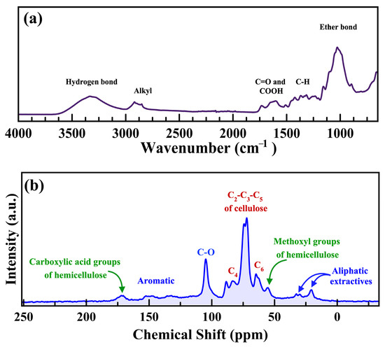 Figure 1 displays the ATR FT-IR and 13C NMR spectrum of flax straw. As anticipated in the FT-IR spectrum (Figure 1a), the broad signature of the hydrogen bond of –OH functional groups is obvious at 3000–3500 cm−1. Other features include weak IR bands near 2900 cm−1 related to C-H stretching, 1700 cm−1 to carbonyl and carboxylic acid groups, 1370 cm−1 to –CH and –CHOH, and 1160 cm−1 to C-O-C stretching [54]. The 13C NMR spectra of the biomass sample represented in Figure 1b consists of eight main signatures that appear between 20 and 180 ppm. The chemical shift (δ) values of 13C NMR signals are as follows: aliphatic extractives (20–25 ppm), methoxy groups of hemicellulose (55–60 ppm), C2-3-5 of cellulose (70 ppm) and C4 of cellulose (80–85 ppm), Ether bonds (110 ppm), aromatic groups (125–145 ppm), and carboxylic acid groups of hemicellulose (170 ppm) [55,56]. These results preliminarily support the biochemical composition analysis of the flax straw biomass and are consistent with prior reports [35].