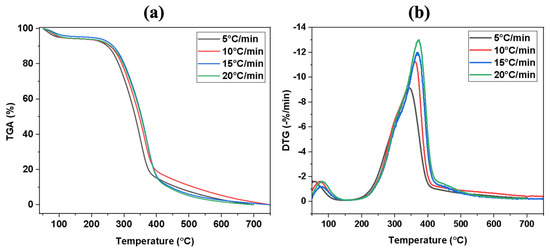(a) TGA and (b) DTG profiles of flax straw at different heating rates under pyrolysis condition.