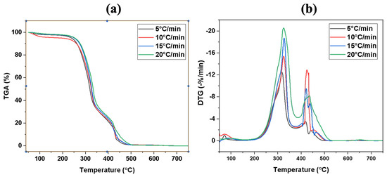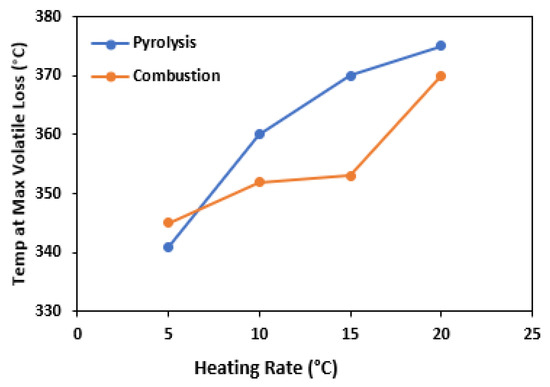 Figure 4 represents the effects of the heating rate on the maximum temperature of degradation for pyrolysis and combustion, respectively. As the rate of heating increases from 5 to 20 °C min−1, the maximum temperature at which degradation occurs also increases. This increase can be attributed to the phenomenon of thermal lag, where biomass requires more time to undergo similar mass loss at a given temperature [59]. As a result, there is a delay in thermal degradation at higher temperatures. In Figure 3a, it was observed that the initiation and completion of devolatilization and char formation steps were postponed as the heating rate was increased. This outcome can be ascribed to the intensified heat flux occurring at higher heating rates, which reduces the cohesion of the material and disrupts its structure, thereby accelerating the reactions and causing more volatile release. A similar phenomenon has also been noted for other biomass samples in the literature [62].